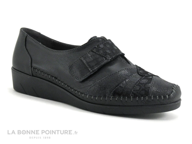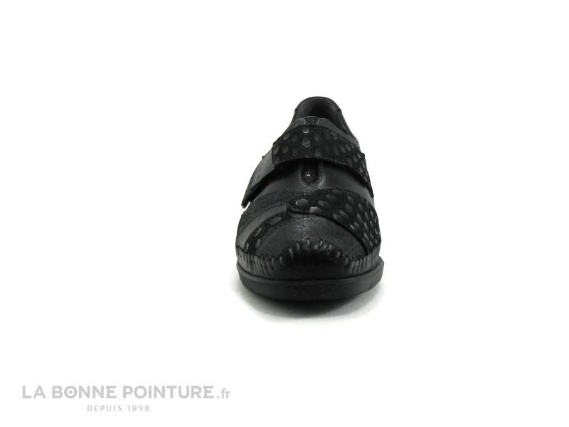 Cette chaussure Femme est en cuir noir, avec des empiècements fantaisie sur le devant.