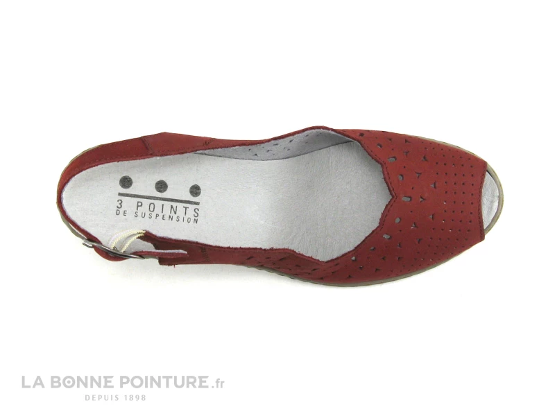 Ce nu-pied Femme est en cuir velouté rouge foncé / bordeaux, orné de petites perforations fantaisie sur le devant.
