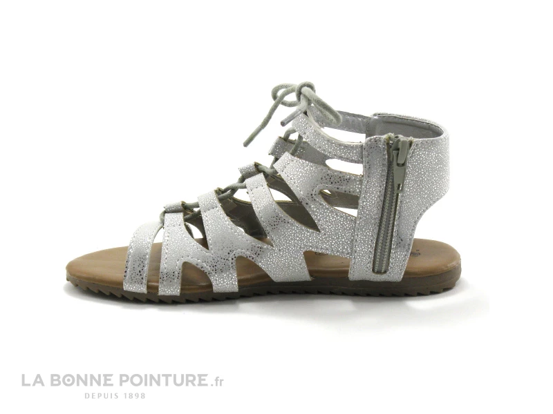 Cette chaussure enfant est argent pailleté, avec un lacet gris qui traverse 4 oeillet et permet d’ajuster la sandale spartiate au pied de l’enfant.