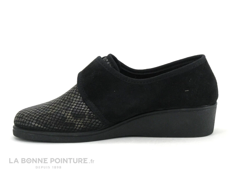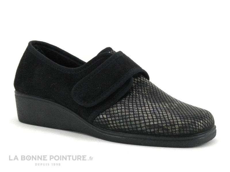Ce chausson Femme A Campello associe un velours noir et un textile aspect reptile noir et beige grisé.
