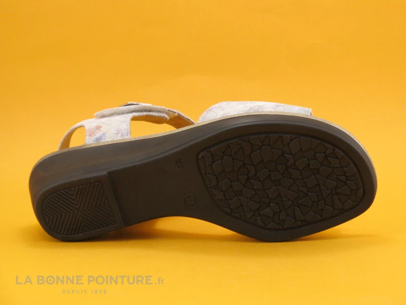 Cette sandale Femme Artika Naty Virginia est en cuir velouté blanc argenté, imprimé de fleurs aux tons pastels.