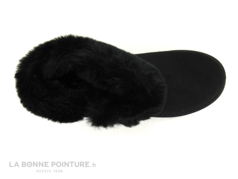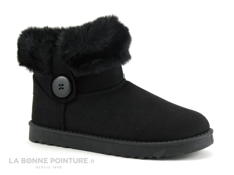Ces boots fourrée noires sont en textile velouté, avec un large revers en fourrure et un bouton décoratif sur le côté.