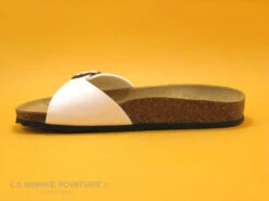 La semelle de marche des nu-pieds Biomodex est souple, liège et argent sur une base blanche.