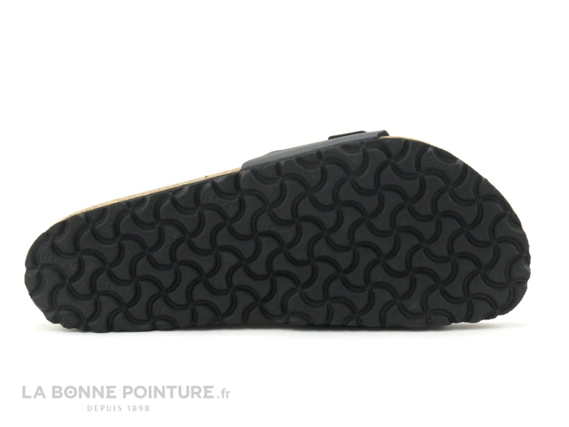 Cette mule Homme de grande qualité Birkenstock Madrid est en Birko Flor® noir mat, une matière synthétique résistante et hypoallergénique.