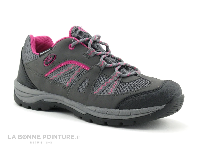 Ces baskets randonnée Femme mélangent textile et matières synthétiques résistantes gris foncé et rose fuchsia.