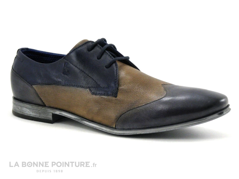 Ce derbi habillé Homme combine du cuir beige, noir grisé et bleu marine.