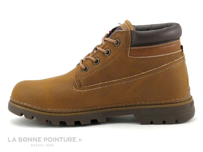Cette chaussure montante Homme est en simili cuir marron clair nuancé, à l’aspect velouté.