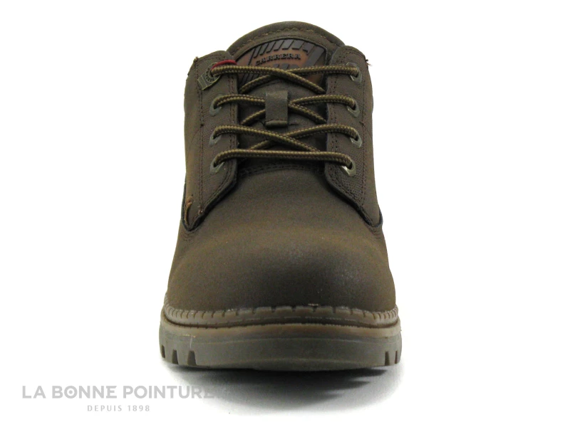 Ce derbi Homme pas cher est marron foncé aspect velouté, avec une partie noire et matelassée autour de la cheville.