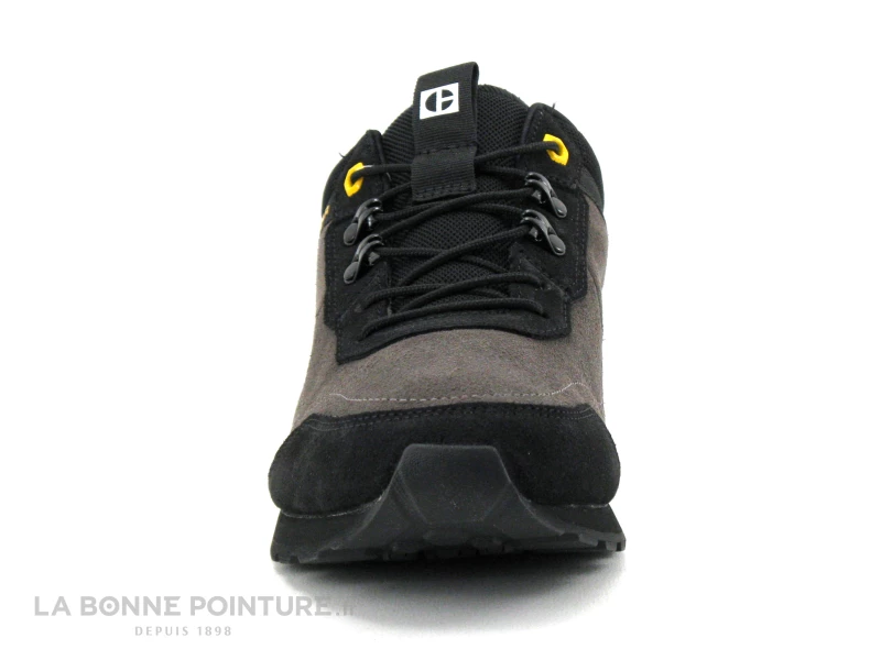 Cette basket de ville Homme Caterpillar Ventura P110702 est en cuir velours et textile noir, gris et jaune foncé. La marque Caterpillar s’affiche en jaune sur le côté externe de la chaussure.