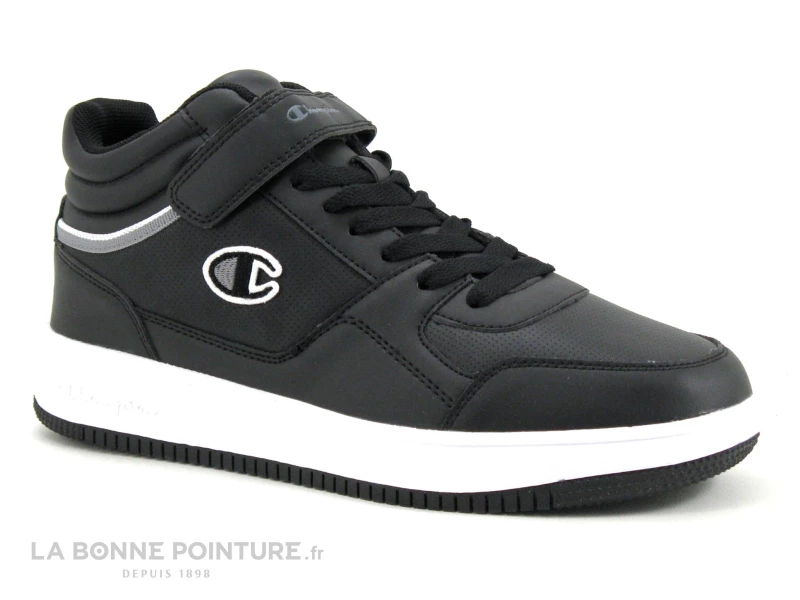 Ces belles sneakers montantes Homme Champion Rebound Vintage S21904 sont en simili cuir noir, avec un liseré gris et blanc sur les côtés.