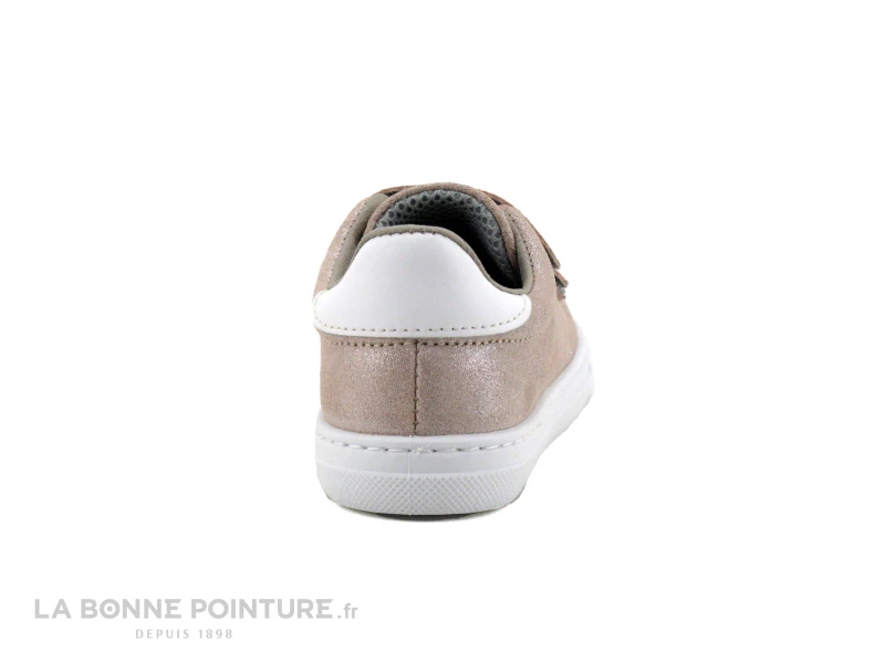 Cette basket de ville fille Cienta 8006 est en cuir velouté rose métallisé, avec un peu de cuir lisse blanc à l’arrière.