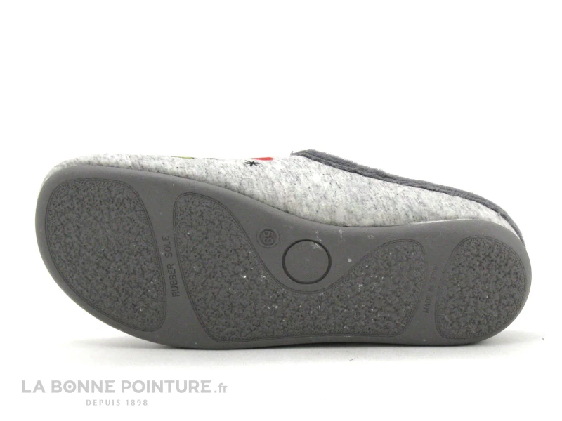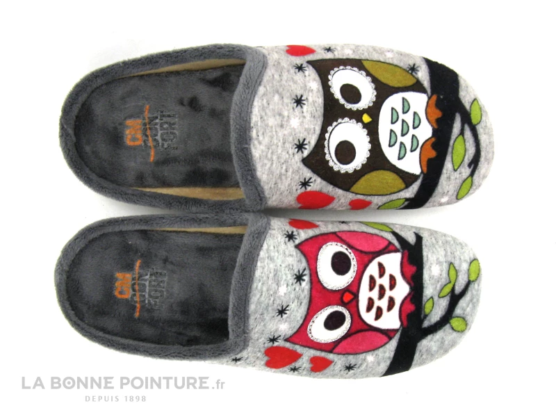Cette mule d’intérieur Femme pas chère est en velours gris, avec deux charmants hiboux aux yeux cerclés d’argent.