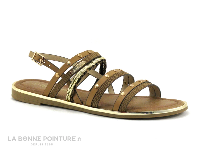 Sandales mode et pas chères Femme, les tongs camel et or Dees Shoes Moneda à petit prix !