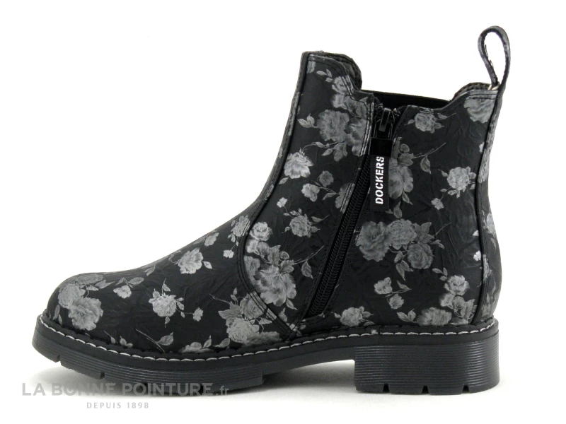 Cette bottine Dockers Femme est en simili noir aspect légèrement froissé, imprimé de fleurs aux tons de gris argenté et de doré.