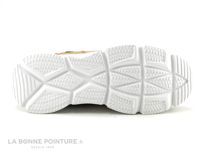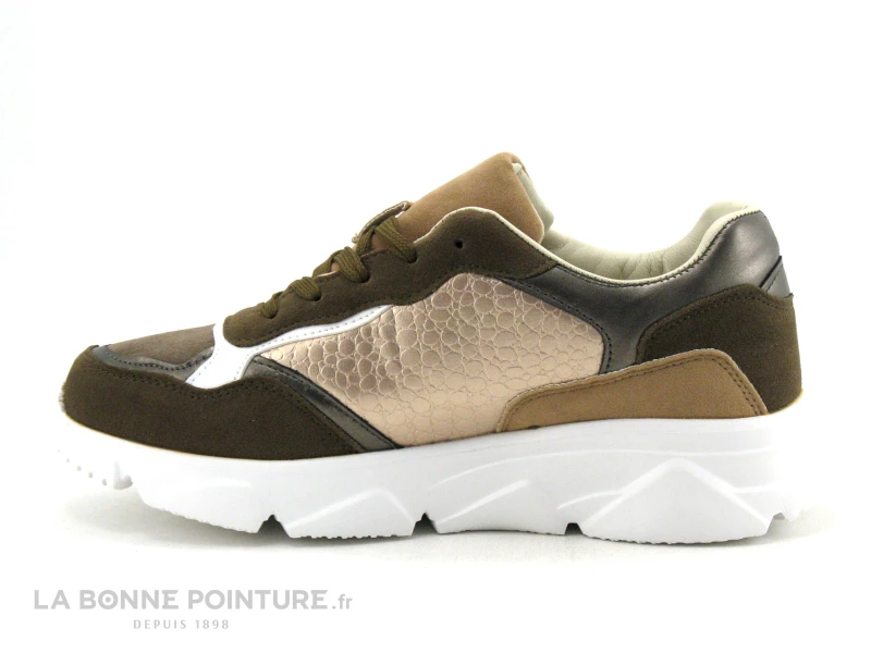 Cette sneaker légère Femme est en textile velouté et simili cuir métallisé, aux tons de kaki, de marron bronze, de beige et de gris.