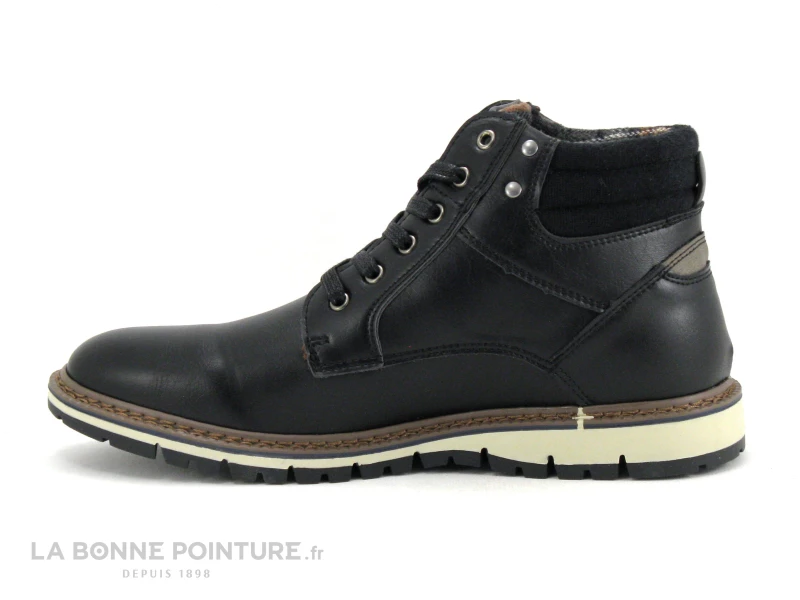 Cette chaussure montante Homme Enzo Marconi est en simili cuir noir, avec la partie haute rembourrée en textile et un petit empiècement gris à l’arrière.
