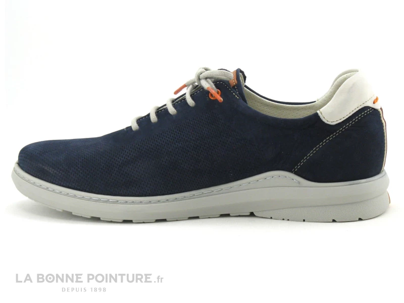 Cette basket de ville Homme Fluchos est en cuir velouté bleu marine finement poinçonné, avec un peu de blanc cassé et d’orange.