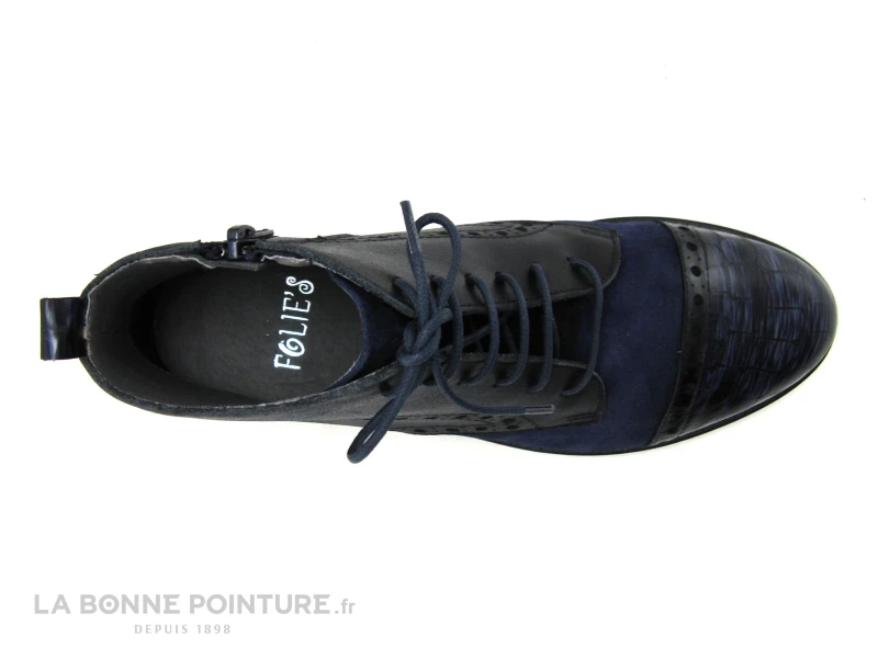 Cette belle chaussure montante Femme Folies mélange harmonieusement un cuir lisse, velouté et effet croco bleu marine.