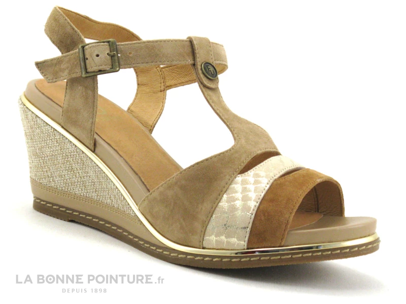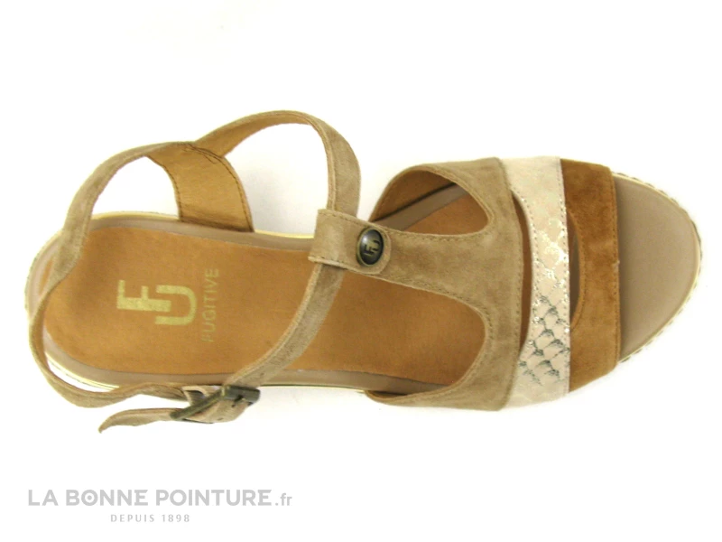 Ces beaux nu-pieds Femme Fugitive sont en cuir velours beige (mastic), avec des bandes camel et imprimé beige et or.