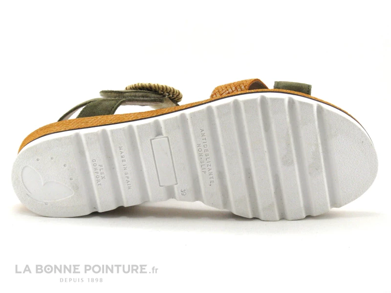 Ce nu-pieds mode Femme et adaptĂ© pieds larges Geo Reino mĂ©lange un beau cuir veloutĂ© kaki avec un cuir velours orange, Ă l’aspect tressĂ© et pailletĂ©.