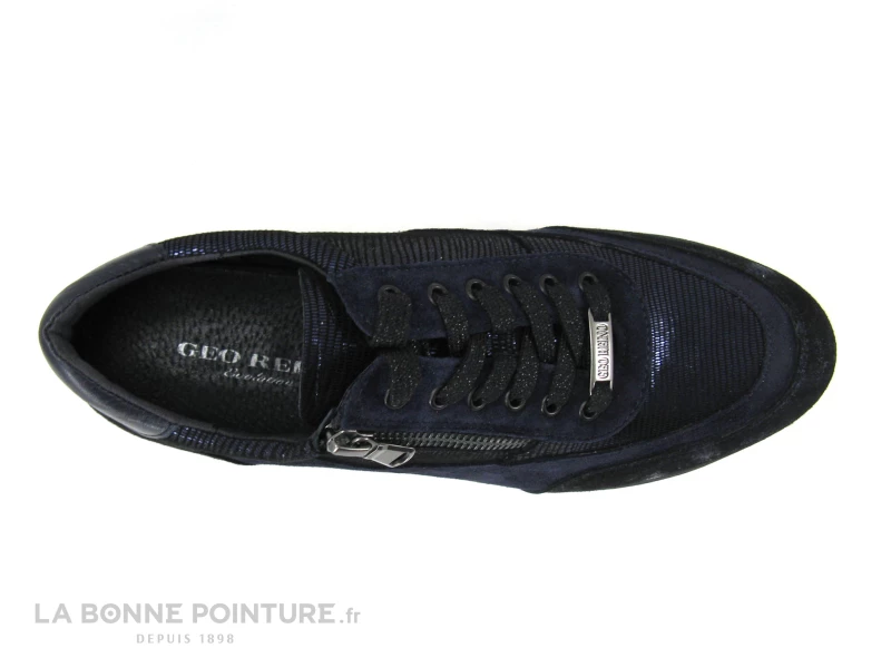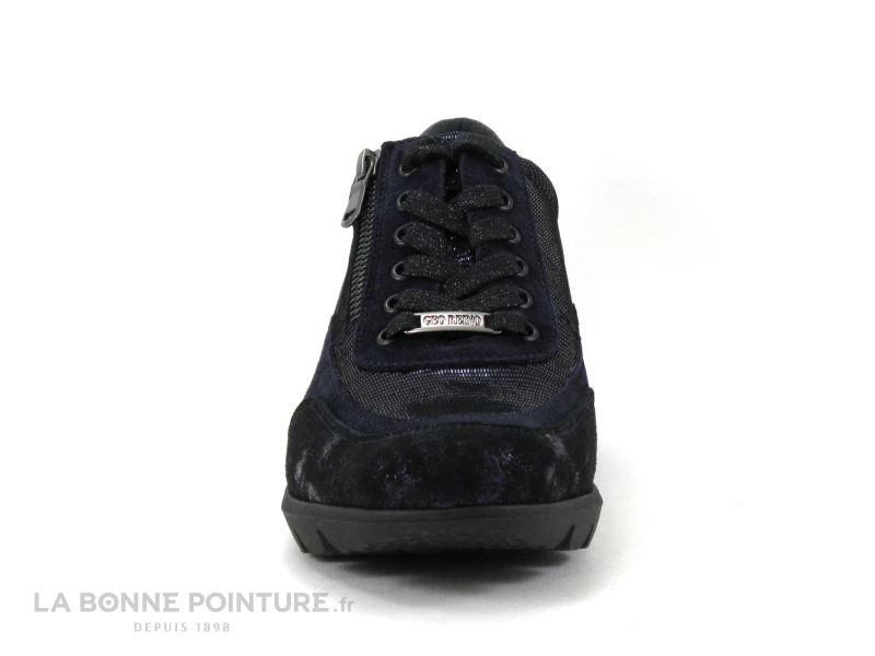 Cette basket de ville Femme Geo Reino Malvabe en cuir cuir velouté bleu marine, avec du noir et des parties métallisées.