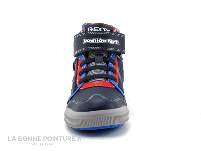 La basket montante garçon Mariokart Géox propose un mélange de couleurs gaies et harmonieuses allant du bleu marine avec des surpiqûres bleu électrique, d’autres rouges et quelques touches de gris.