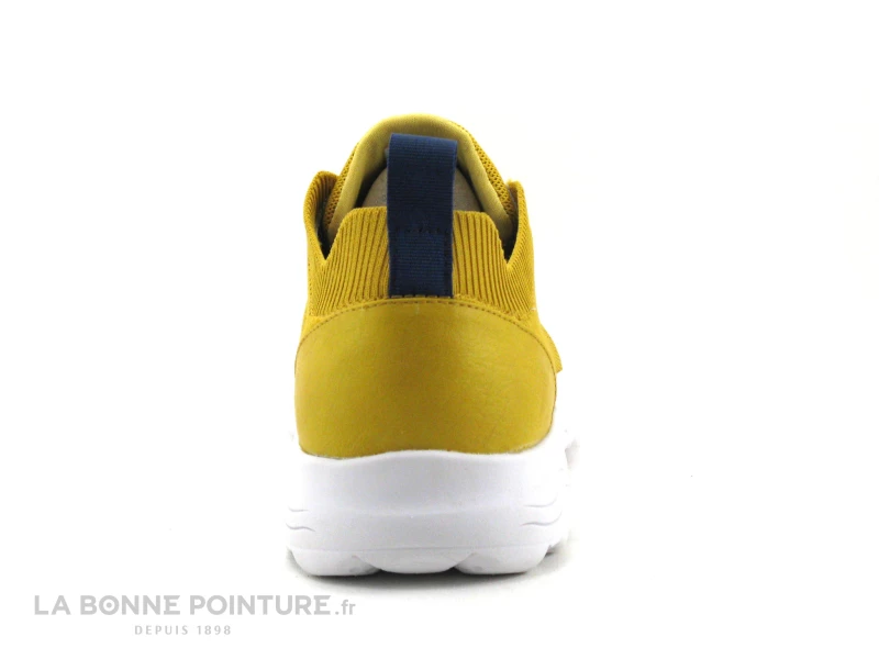 Le contrefort Ă l’arrière est en simili cuir jaune aussi, avec une languette bleu marine qui aide Ă enfiler la chaussure Geox Homme.