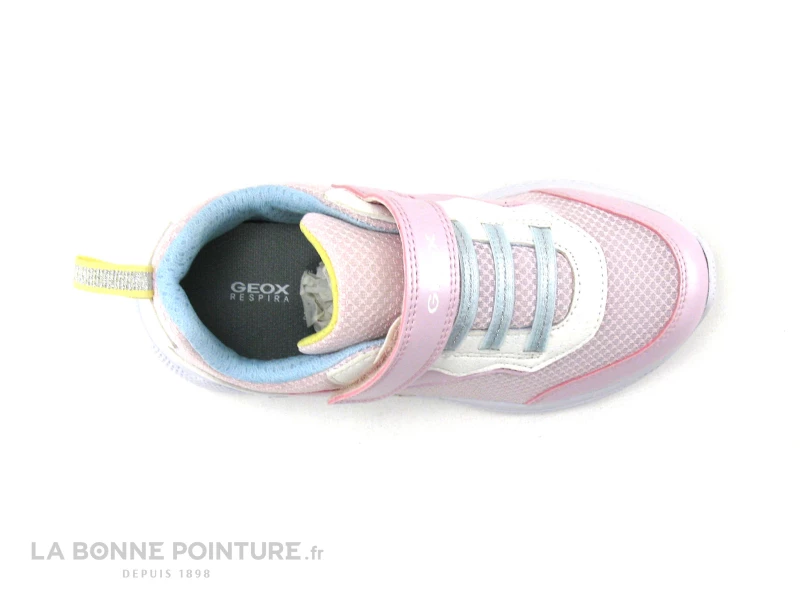 Cette basket fille Geox Respira est en textile et matières synthétiques résistantes aux tons de rose, de bleu clair et de blanc légèrement pailleté.