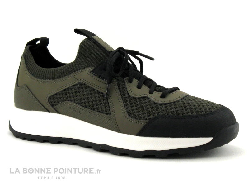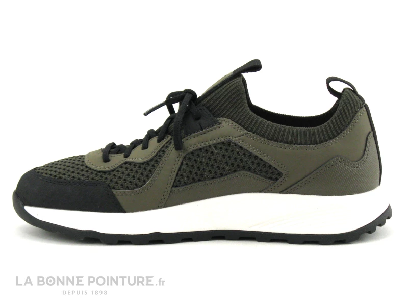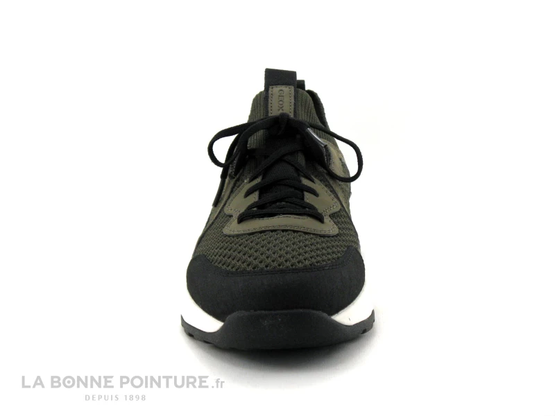 Cette basket sans lacet Homme Geox Terrestre est en maille et matières synthétiques résistantes vert kaki et noires.