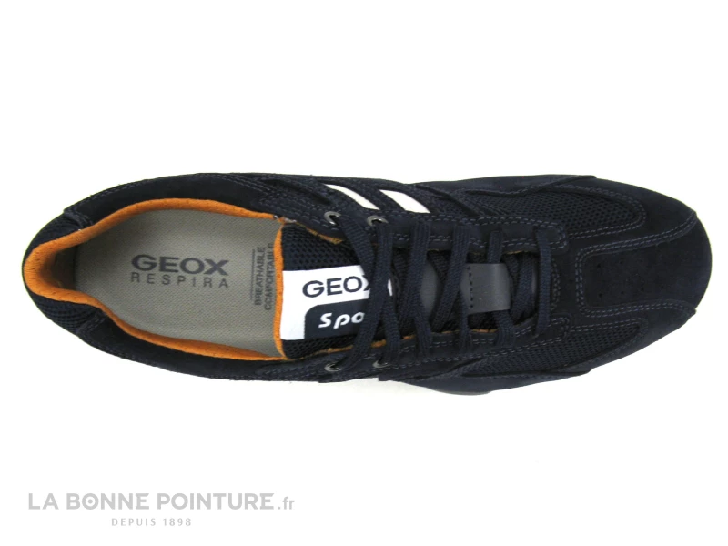 Cette basket de ville Homme Geox est bleu marine, avec un peu de blanc et d’orange.
