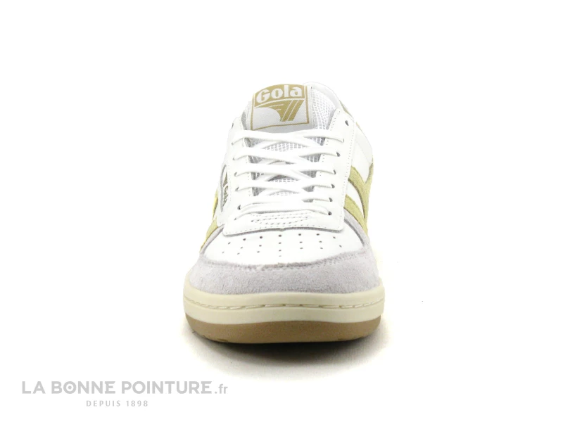 Cette sneaker Femme Gola Hawk combine cuir lisse blanc et nubuck gris et jaune, avec une touche de doré à l’arrière.