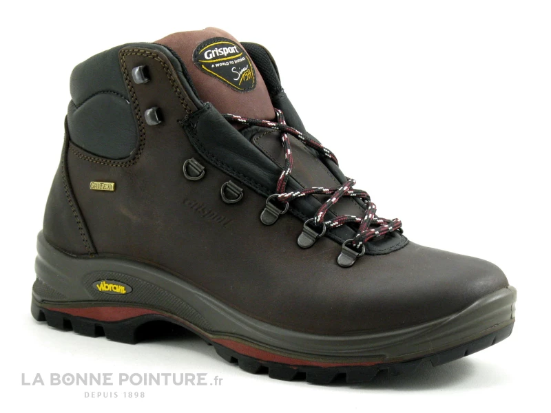 Ce bottillon de marche Grisport est en cuir marron foncé, doublé d’une membrane imperméable Gritex®.