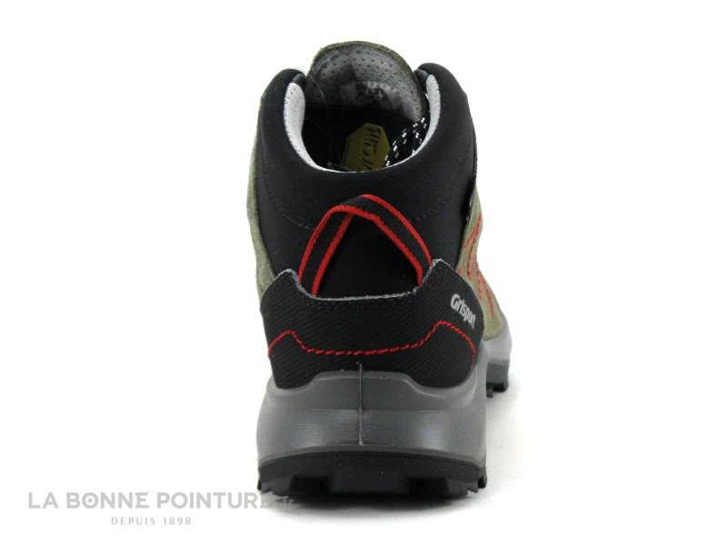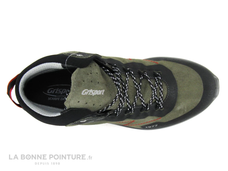 Ces chaussures de marche montantes Homme Grisport 14703V10G combinent cuir velours kaki, matières synthétiques résistantes et textile noir. Une couture rouge orne les côtés.