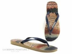 Cette tong est marron clair, couleur sable, avec les brides bleu marine et la marque Havaianas en blanc.