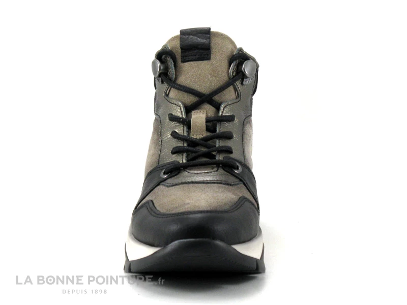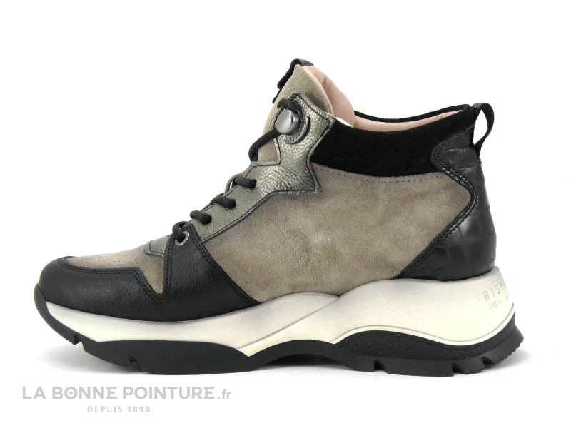 Cette basket montante Femme Ă semelle compensĂ©e est en cuir, combinant des parties noires et taupe veloutĂ©, noir grainĂ©, et bronze mĂ©tal.Â