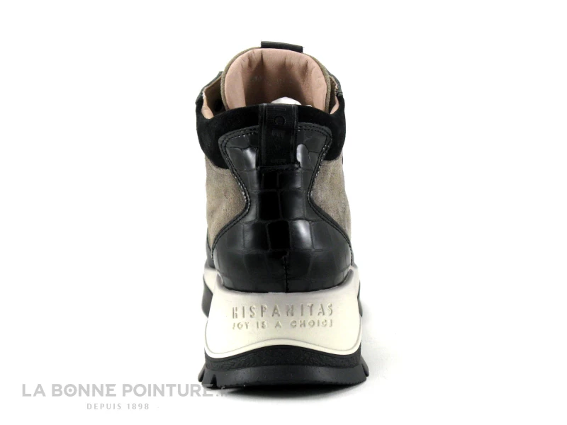 L’arrière des sneakers Hispanitas Bolero se dĂ©marque avec son aspect croco, agrĂ©mentĂ© d’une petite languette noire sur le haut.
