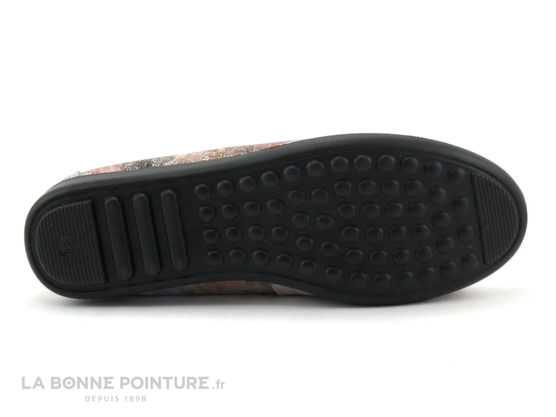 Cette ballerine Femme Inéa Eclat est en cuir imprimé floral rose, avec des reflets argentés et un noeud fantaisie sur le dessus.