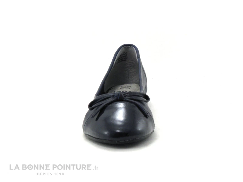 Cette ballerine à bout rond est en cuir lisse bleu marine, avec la pointe en simili cuir bleu verni et un petit noeud sur le dessus.