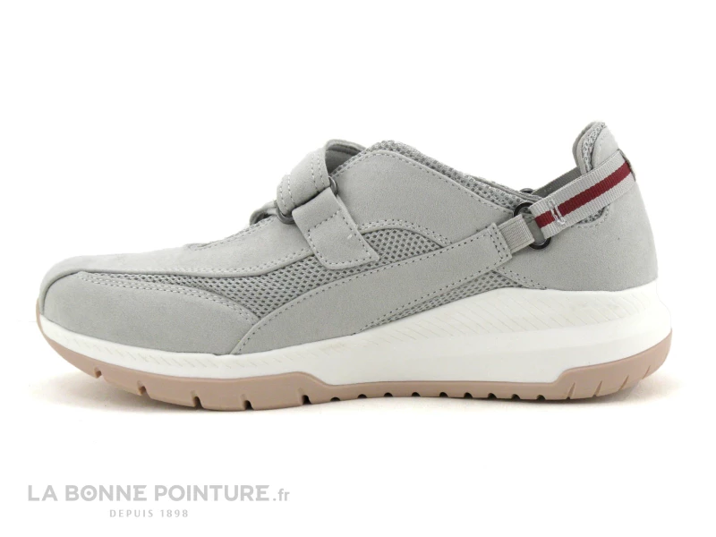 Cette basket confortable Femme Jana est en velours et tissu mesh gris clair, avec un ruban bicolore gris et bordeaux à l’arrière.