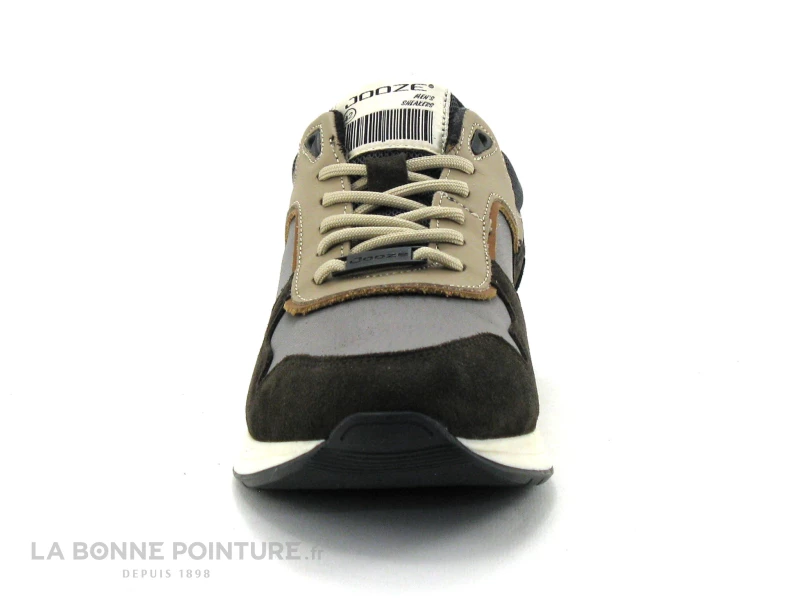 Cette basket de ville Homme Jooze associe cuir et textile, aux tons de marron, de beige, de noir et de gris.