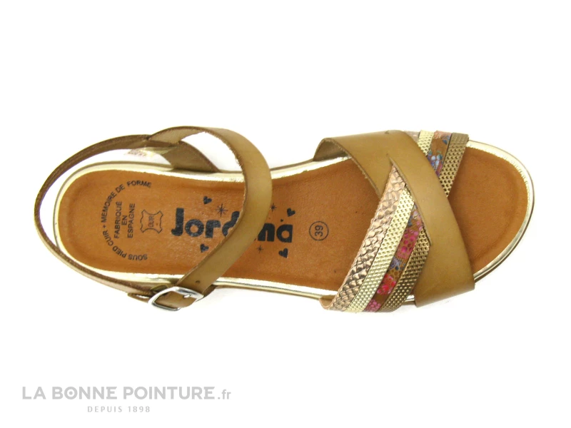 Ce nu-pieds mode Femme Jordana est principalement en cuir marron clair, avec de fines lanières métallisées et imprimées.