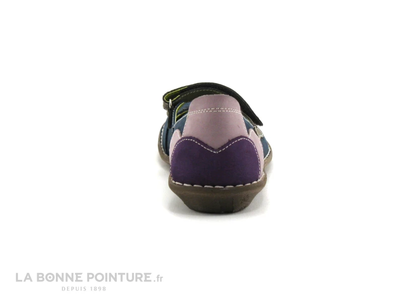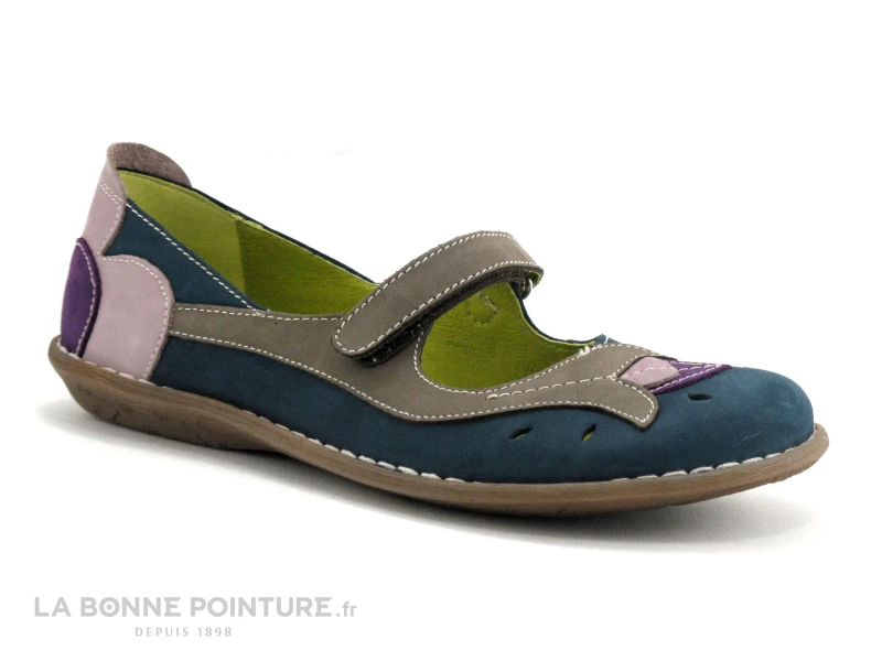 Voici une ravissante ballerine en cuir velouté bleu marine Jungla 4096, avec des empiècements en forme de fleurs et de pétales beige taupe, roses et violets. Des petites perforations ornent la pointe des chaussures, pour une finition réussie.