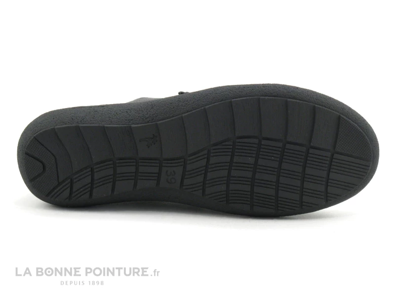 Cette chaussure Femme facile Ă enfiler avec Ă©lastique est en cuir noir Ă©pais, Ă l’aspect grainĂ©.