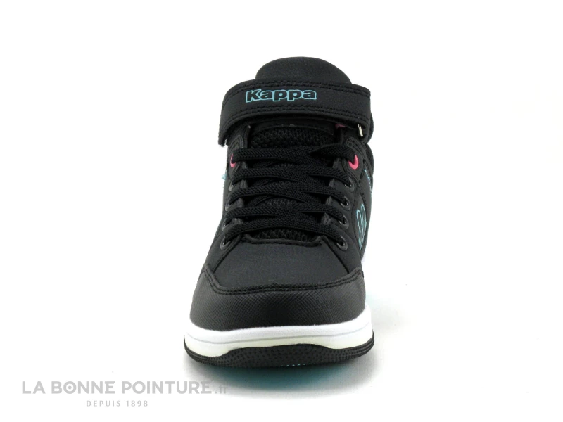 Le pied de l’enfant est confortablement maintenu dans cette basket montante noire dĂ©licatement agrĂ©mĂ©ntĂ©e des logos de la marque Kappa au joli coloris vert d’eau.