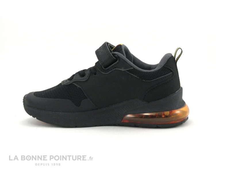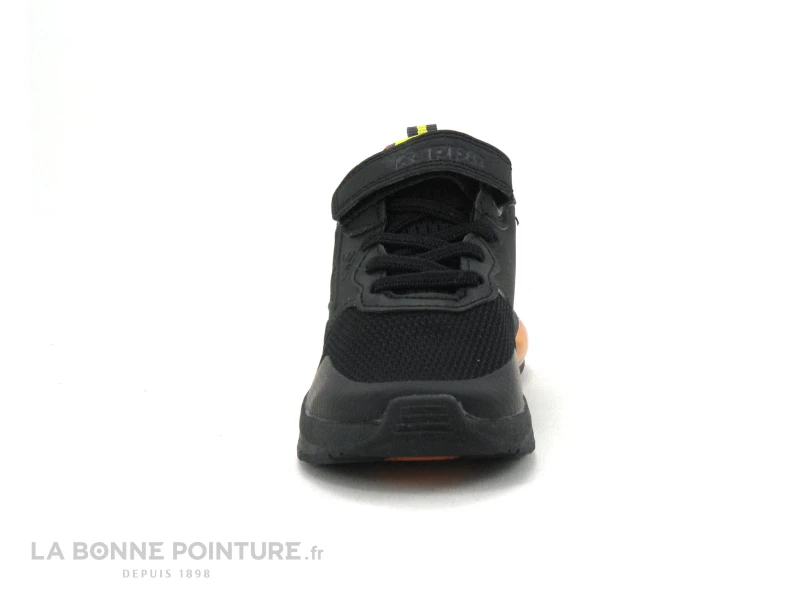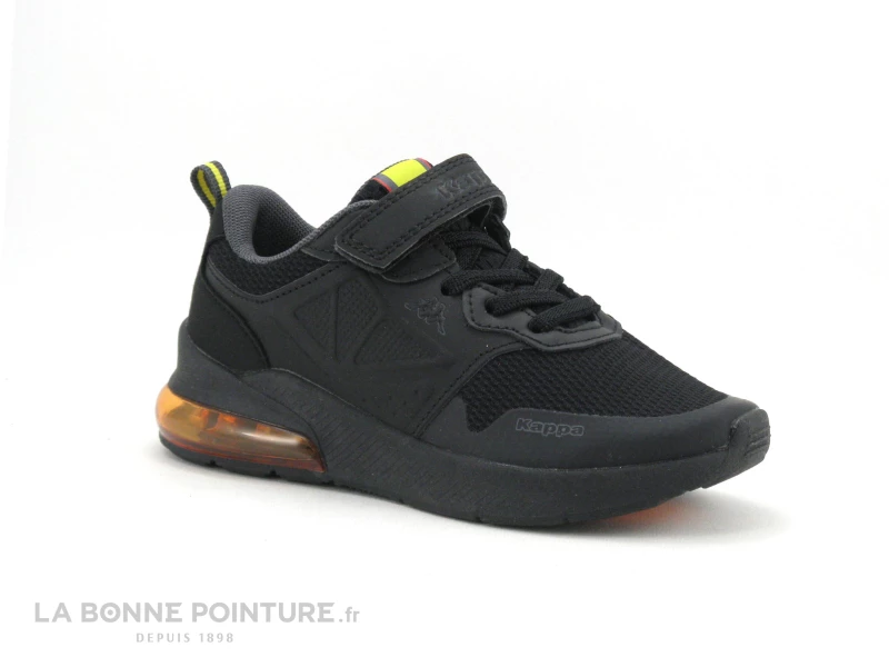 Ces baskets enfant Kappa Kid sont en en textile et matières synthĂ©tiques noirs, avec un peu de jaune et d’orange.