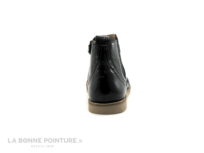 Cette bottine fille est en cuir verni noir, avec des dĂ©coupes sur l’avant ainsi qu’un Ă©lastique noir sur le cĂ´tĂ© externe.