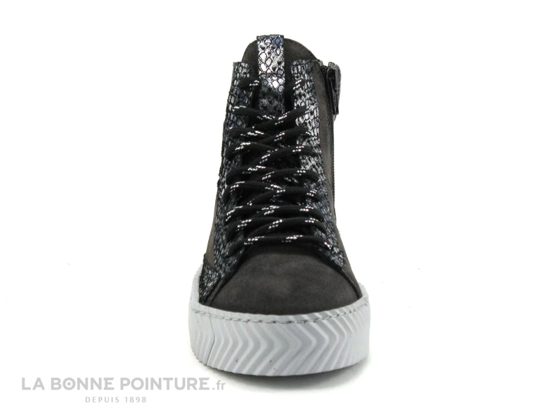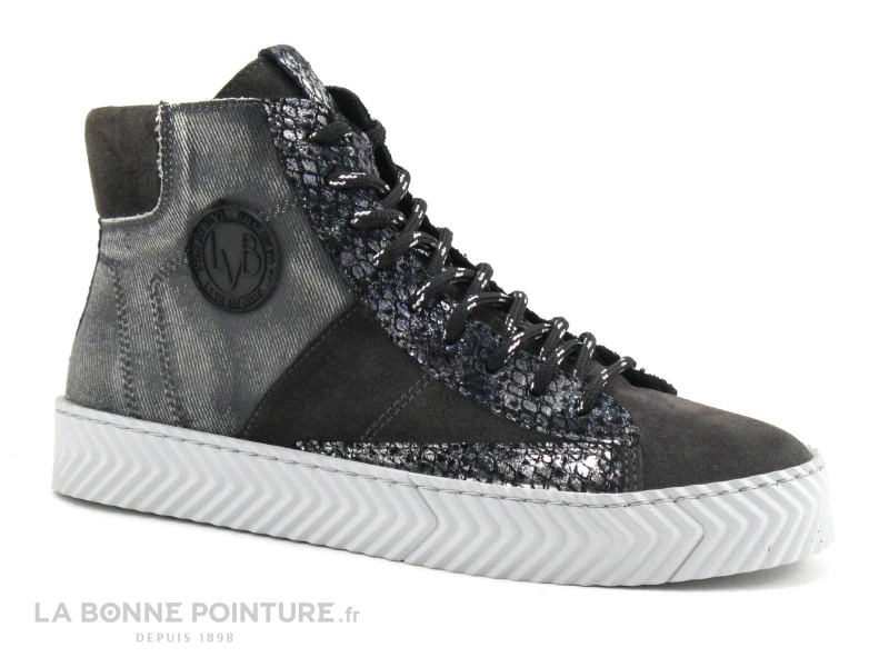 Ces belles sneakers montantes Femme La Vie est belle associent un cuir velouté qui occille entre gris souris et marron, avec des parties aspect denim noir délavé et des empiècements argent python.