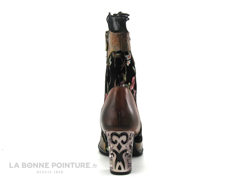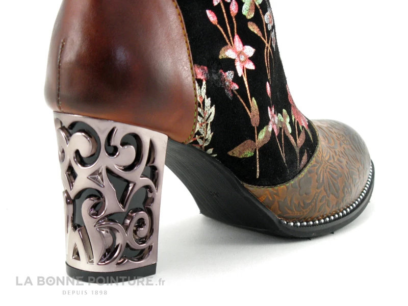 Cette bottine à talon haut combine un cuir marron avec un cuir velours noir imprimé floral, aux tons de vert, de rose et de bronze.