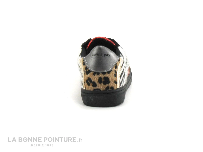 Cette tennis mode Femme mixe des empiècements noir velours, zèbre noir et blanc et léopard beige, avec une touche de rouge métal et de doré : effet garanti !
