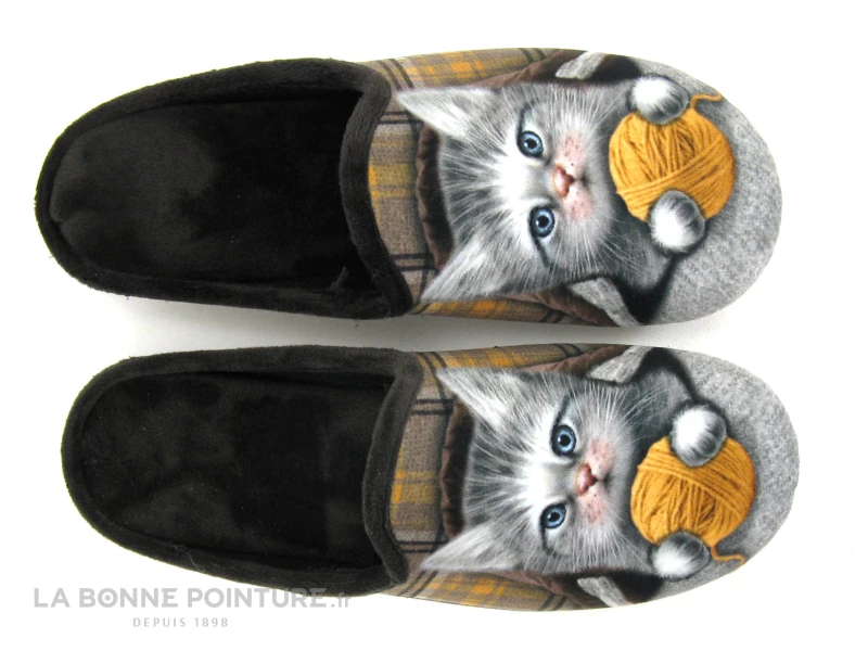 Ce chausson fantaisie Femme est en velours écossais aux tons de marron, de gris et de jaune, avec un adorable chaton gris qui joue avec une pelote de laine.